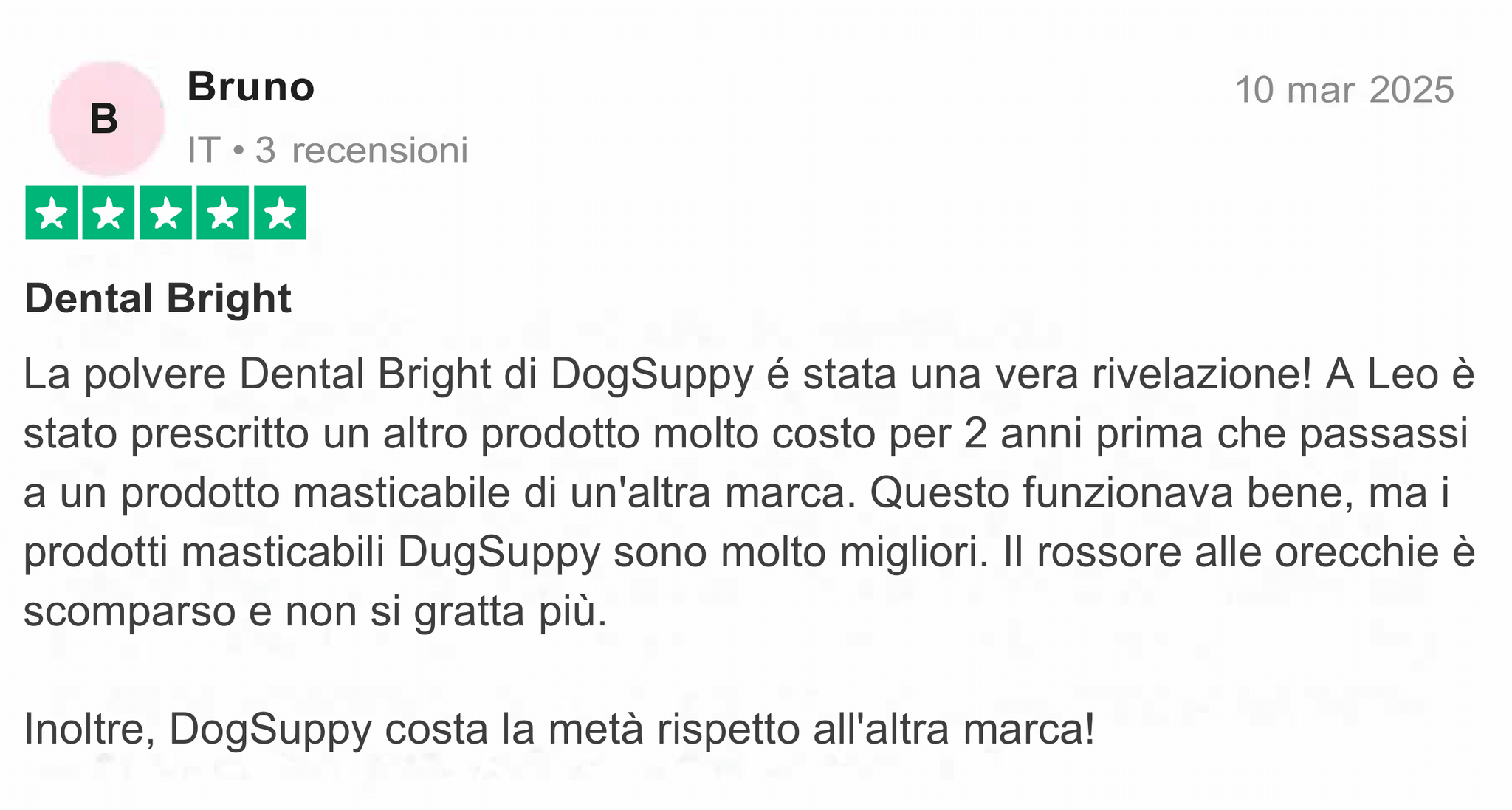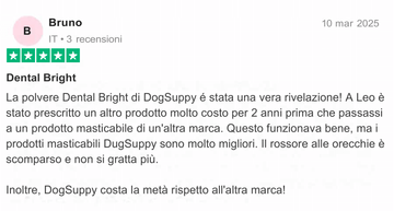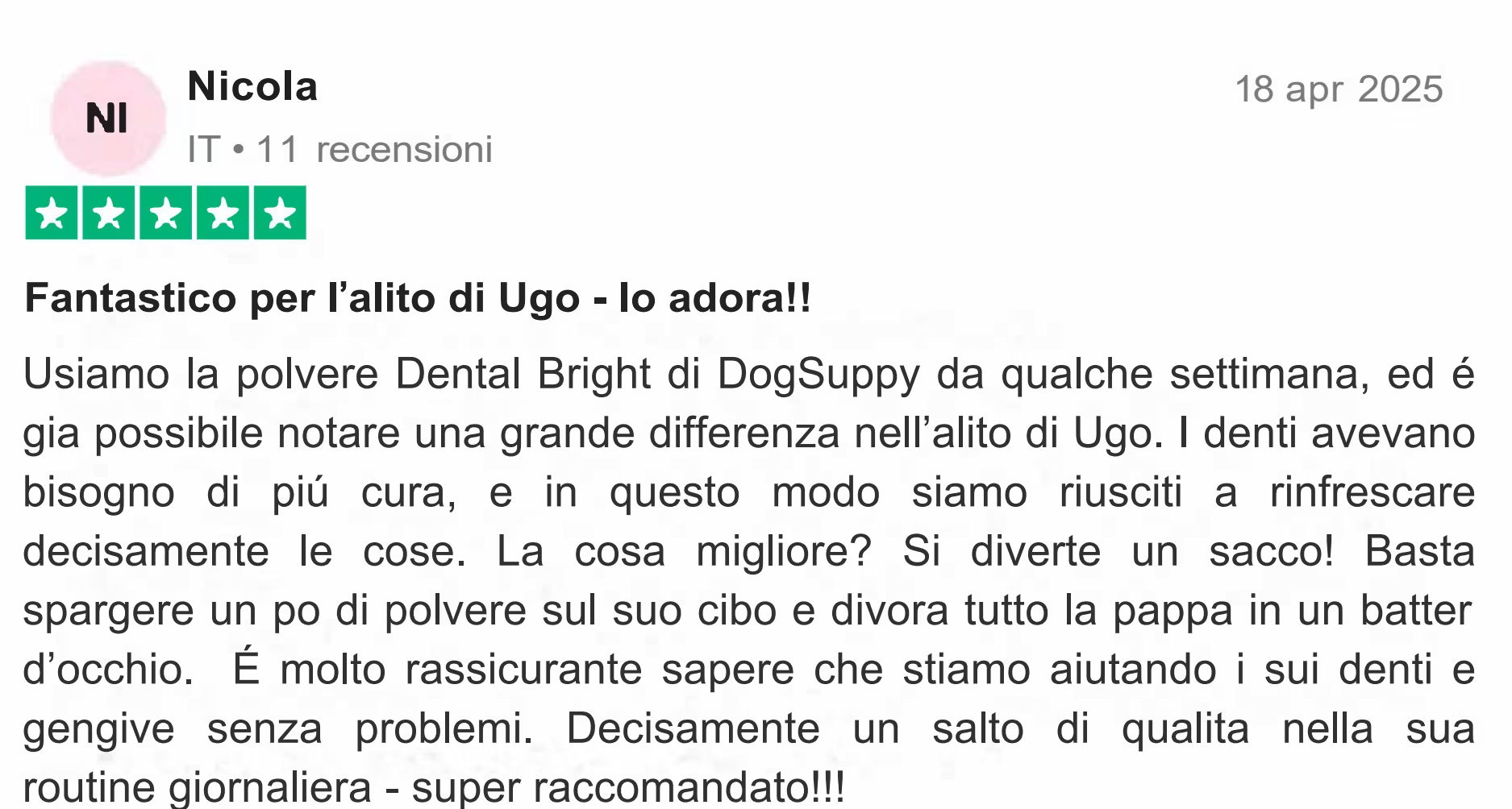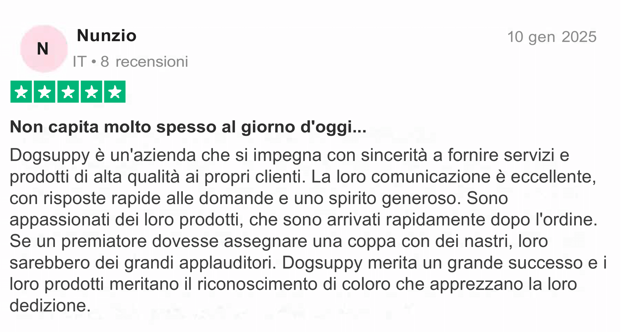 1. Siamo orgogliosi di essere stati valutati come il miglior marchio di integratori per cani su Trustpilot, grazie a migliaia di proprietari di cani soddisfatti. Con oltre 11.000 recensioni entusiastiche e un punteggio impressionante di 4,6/5, dobbiamo tutto questo ai nostri fantastici clienti!