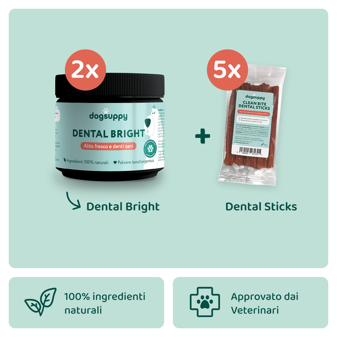 Prenditi cura dei denti del tuo cane con questo potente pacchetto Denti Totale. La nostra soluzione Dental Bright previene la formazione della placca e garantisce un alito fresco. Inoltre i Dental Sticks rafforzano ulteriormente i denti: grazie alle loro esclusive scanalature, levigano i denti anche nei punti più difficili da raggiungere. Questo pacchetto contiene: