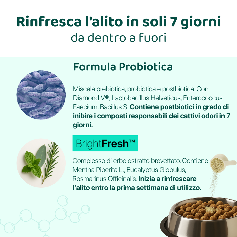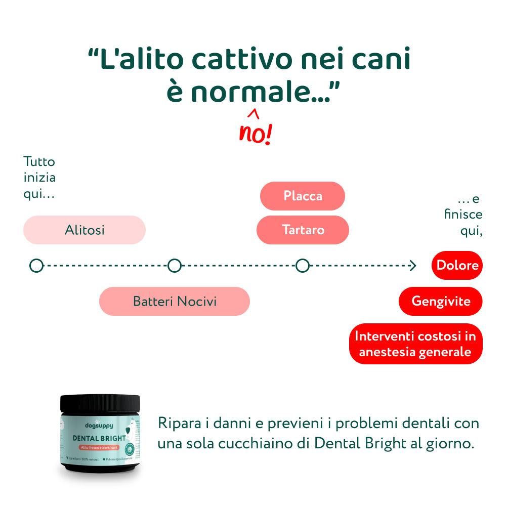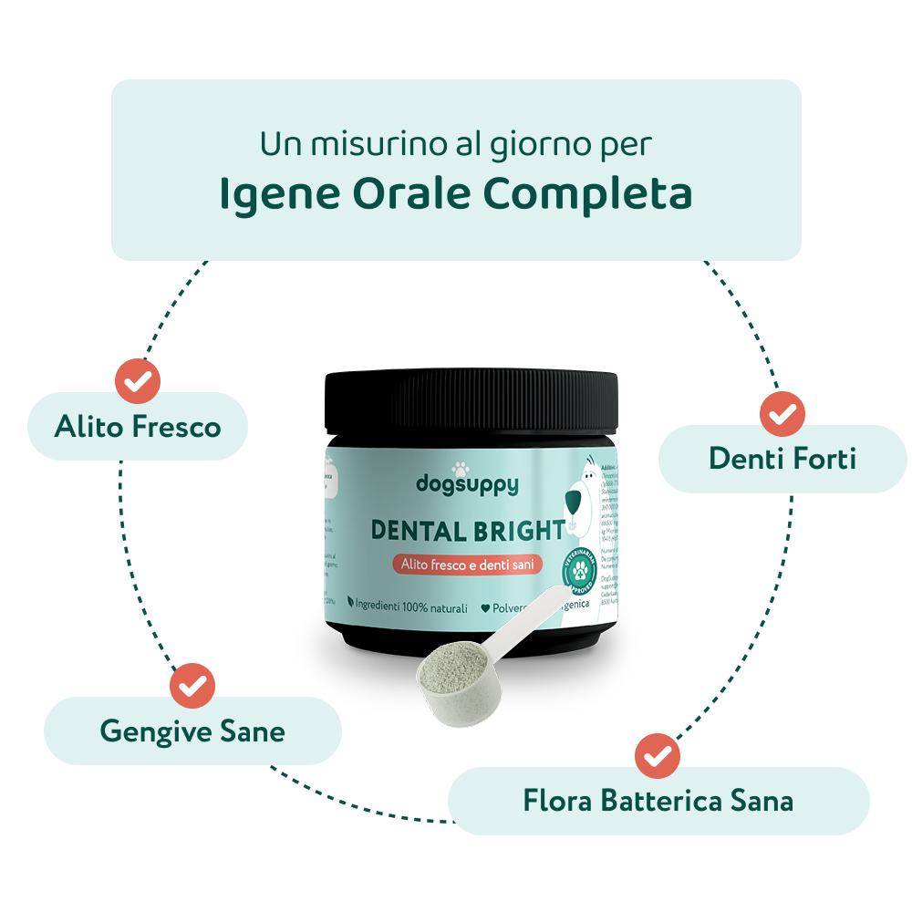 Dental Bright ĆØ studiato per rinfrescare l'alito del vostro cane e ridurre l'accumulo di placca e tartaro.