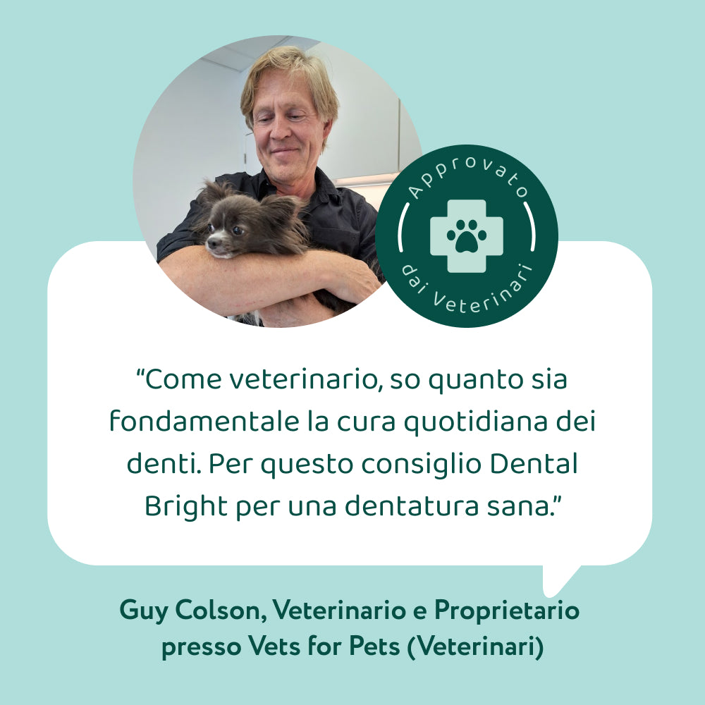 āConsiglio Dental Bright come efficace integrazione alla routine di igiene orale dei cani. Stimola la produzione di saliva, che aiuta a ridurre la placca e a migliorare l'alito. Soprattutto per i proprietari che trovano difficile spazzolare i denti al proprio cane, questo prodotto offre un modo semplice e senza stress per prendersi cura quotidianamente della salute dentale del proprio animale domestico.ā - Guy Colson, veterinario. FacoltĆ di Medicina Veterinaria, Gand (1990).