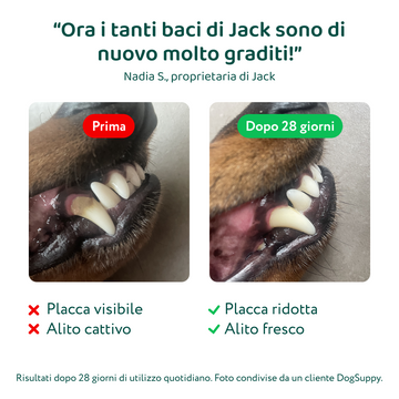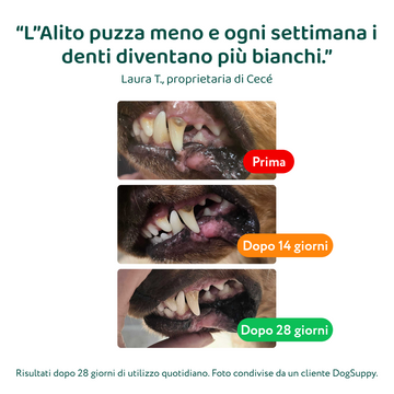 La maggior parte dei cuccioli mostra risultati positivi in 3-6 settimane, tra cui alito piĆŗ fresco, meno placca, denti sfavillanti, e una bocca decisamente piĆŗ sana. Questo dipende da molti fattori; il tempo varia in base al salute ora del tuo amico peloso. Per questa ragione, offriamo 60 giorni di tempo di soddisfatti o rimborsati in modo che abbiate abbastanza tempo per vedere i benefici in prima persona.