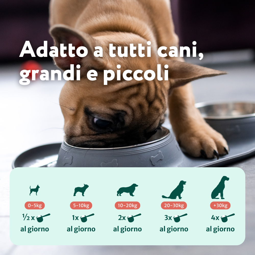 Le nostre formule sono calcolate in a base al peso del tuo amico peloso. Ogni 10 kili di peso puoi spargere una dose sopra al cibo del tuo cane. Usando il misurino, allāinterno della confezione per dosare la polvere.