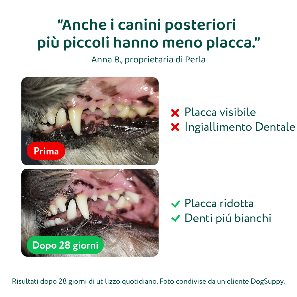 La maggior parte dei cuccioli mostra risultati positivi in 3-6 settimane, tra cui alito piú fresco, meno placca, denti sfavillanti, e una bocca decisamente piú sana. Questo dipende da molti fattori; il tempo varia in base al salute ora del tuo amico peloso. Per questa ragione, offriamo 60 giorni di tempo di soddisfatti o rimborsati in modo che abbiate abbastanza tempo per vedere i benefici in prima persona.