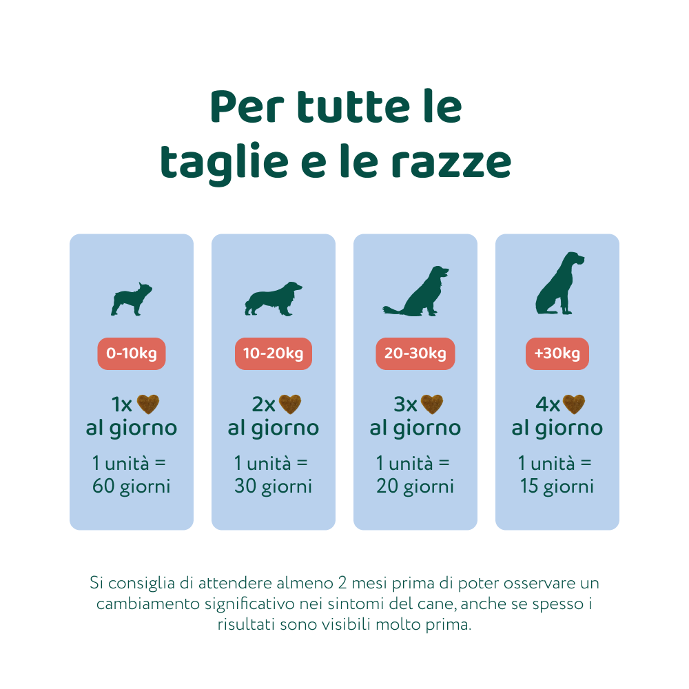 Le nostre formulazioni sono calcolate in base al peso del tuo cane. Per ottenere risultati ottimali, somministra un integratore ogni 10 kg di peso corporeo.
