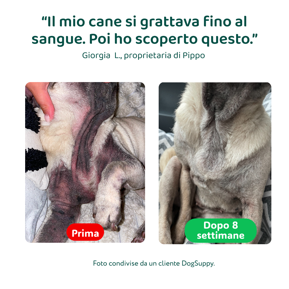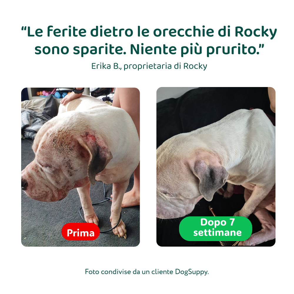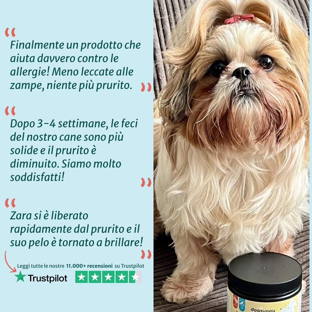L'83% dei nostri clienti nota effetti positivi entro 6 settimane, mentre per alcuni ci vuole un po' più di tempo, fino a 8 settimane. I probiotici e i principi attivi naturali agiscono sulla causa principale di problemi quali prurito, leccamento delle zampe, infezioni da lieviti e consumo eccessivo di erba: ecco perché può volerci del tempo prima di vedere i risultati. Il tempo necessario dipende principalmente dalla salute intestinale del vostro cane. Per questo motivo, offriamo una garanzia di rimborso di 60 giorni sul vostro primo ordine, dandovi il tempo sufficiente per sperimentarne i benefici.