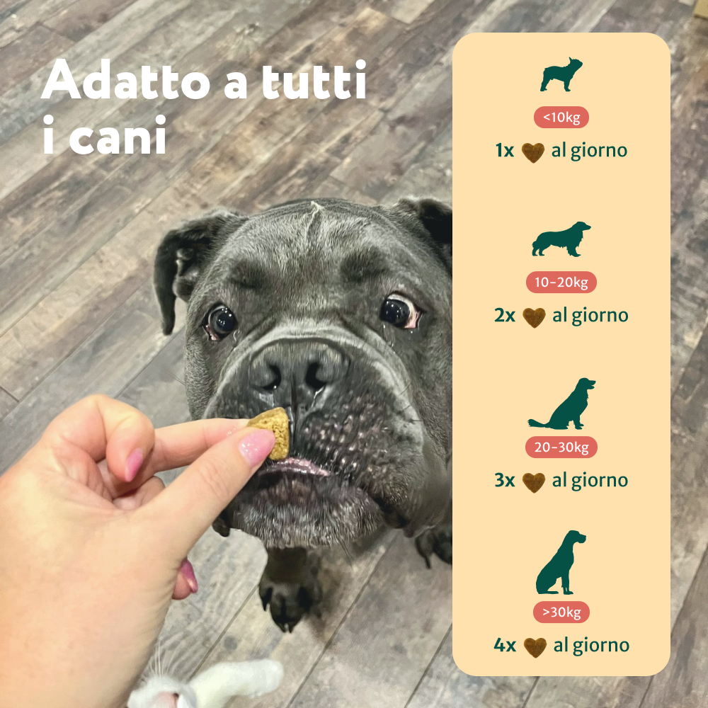Le nostre formule sono calcolate in base al peso del tuo cane. Per ottenere risultati ottimali, somministra un integratore ogni 10 kg di peso corporeo.